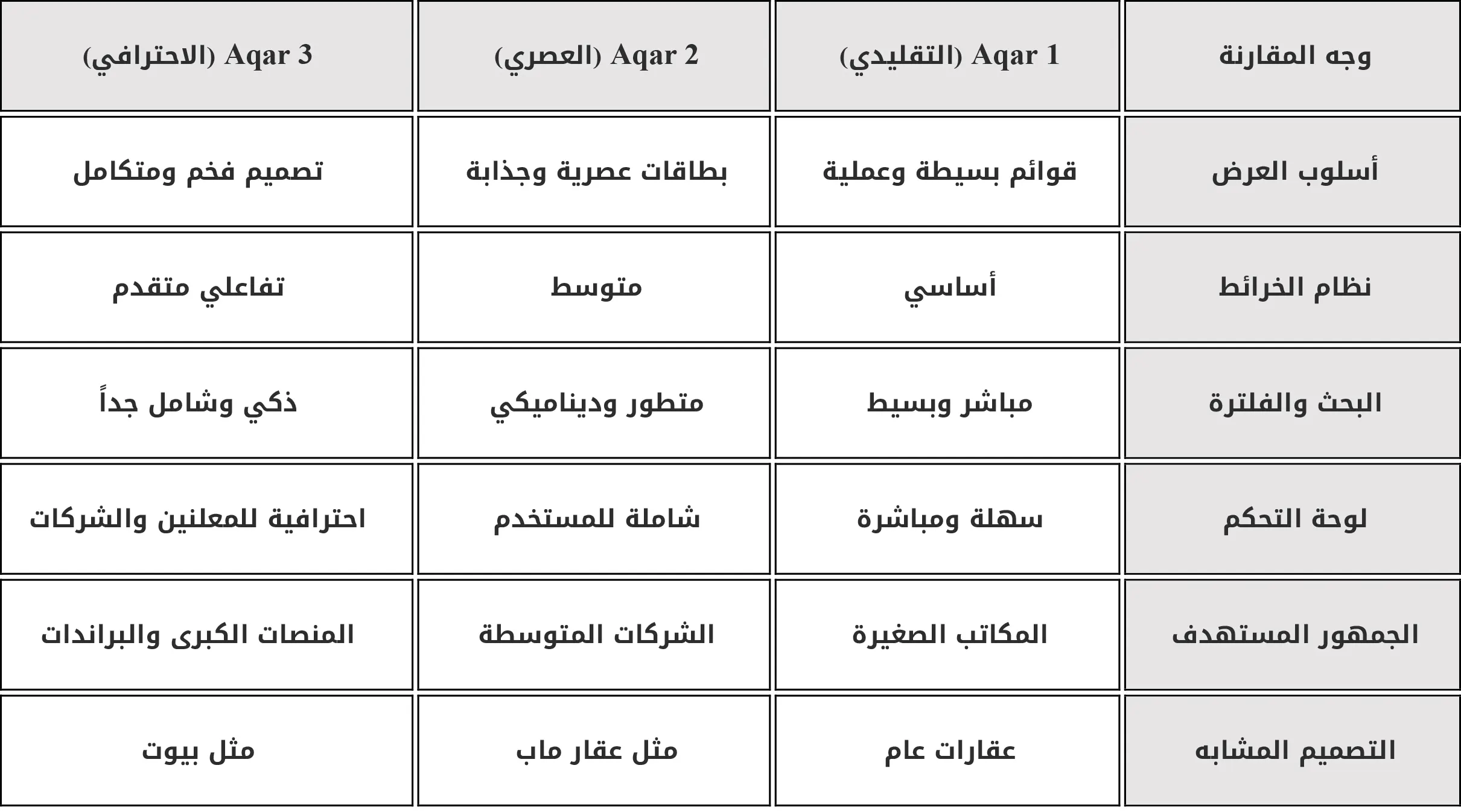 إليك المميزات والفروقات الجوهرية بين الإصدارات الثلاثة (Aqar 1, Aqar 2, Aqar 3):